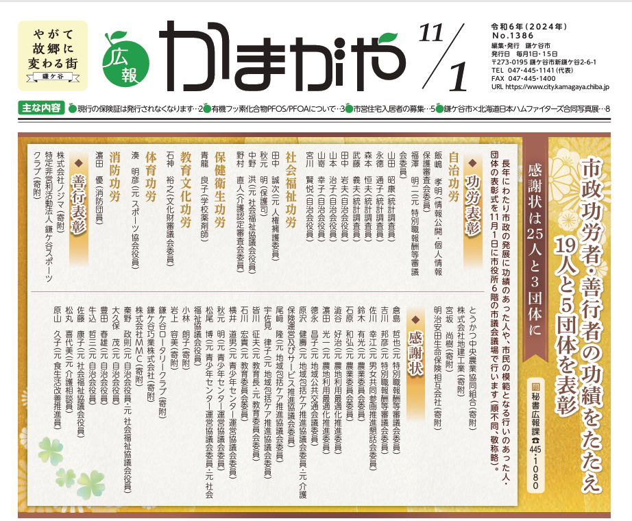 令和6年11月1日、代表弁護士の飯嶋孝明が、鎌ケ谷市より、市政功労者として表彰されました。